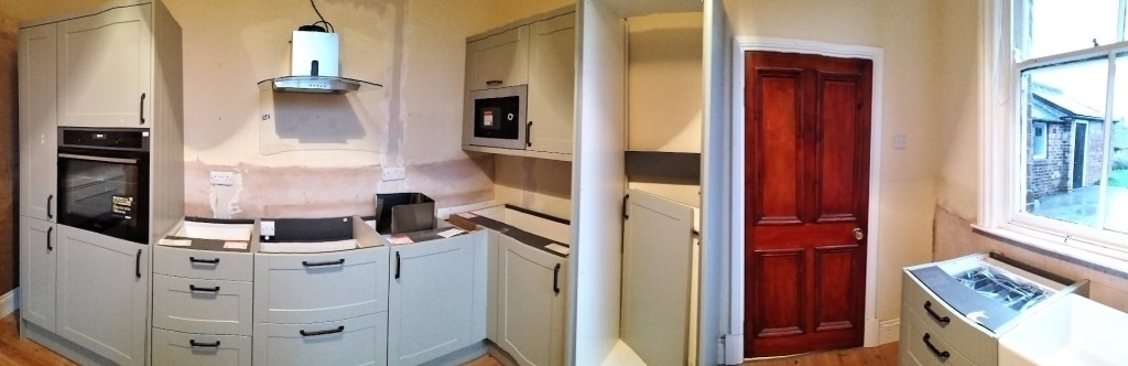 It looks great so far and is what we wanted. The oven, hob, microwave and dishwasher are integrated. The freezer is going in the cellar and the washing machine in the utility room.