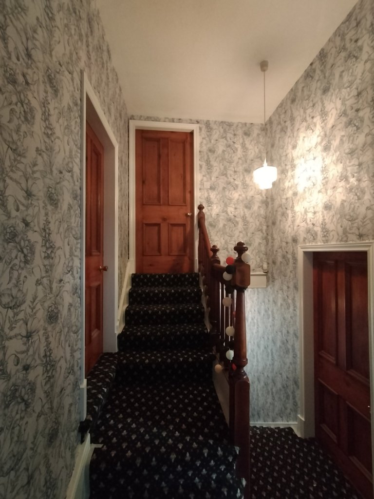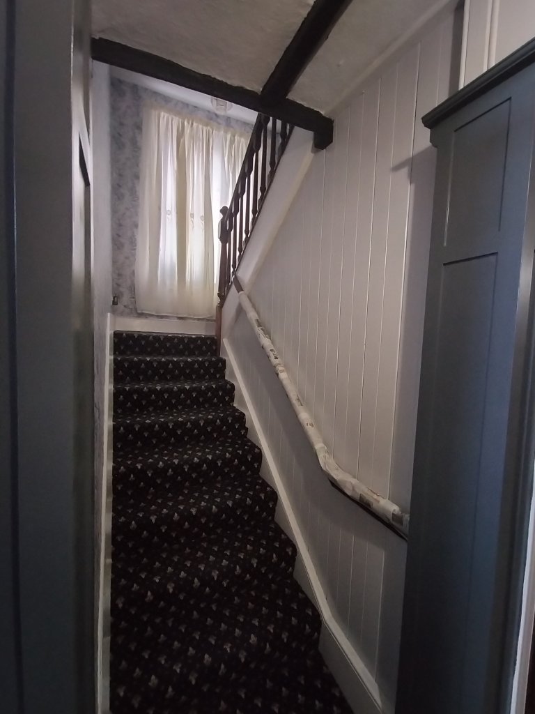 The stairs lead off the middle of the hall passageway. They are a variety of heights and depths and definitely higgledy piggledy (and tricky in parts). The carpet is a dark blue patterned one and we are not replacing it at the moment.