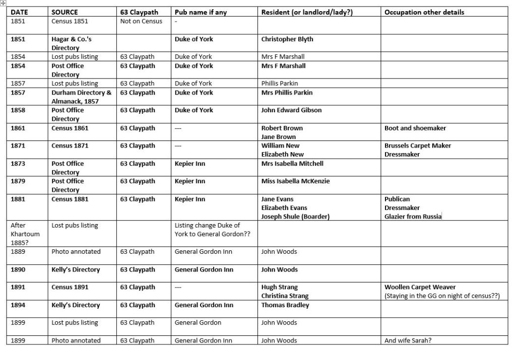 This is the information that I have found out so far. When the house was first a pub or inn, it was the Duke of York and then the Kepier Inn and then the General Gordon Inn from the late 1880s. It seems that quite often the landladies or publicans were women. The census shows the different people who stayed there including carpet makers.