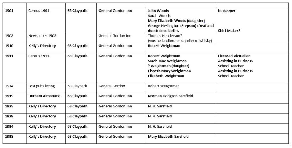 I’ve been researching more about the house – the address 63 Claypath and also the General Gordon Inn. I’ve been to the library to access the censuses that are available and some directories such as Kelly’s, Post Office etc. I’ve also got some information that has come from local history groups on Facebook and other general searching.